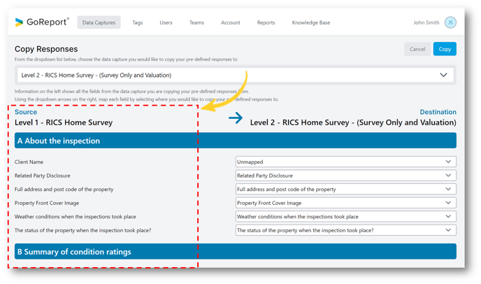 - The information on the left displays all the fields from the data capture from which you are copying your pre-defined responses.