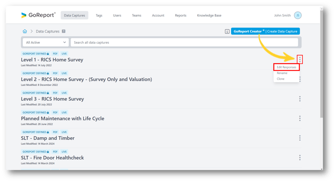 - Select the 3 dots icon on the data capture from which you want to copy responses, and then select Edit Responses.