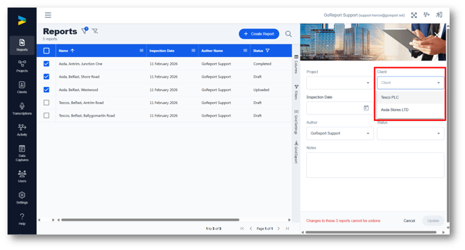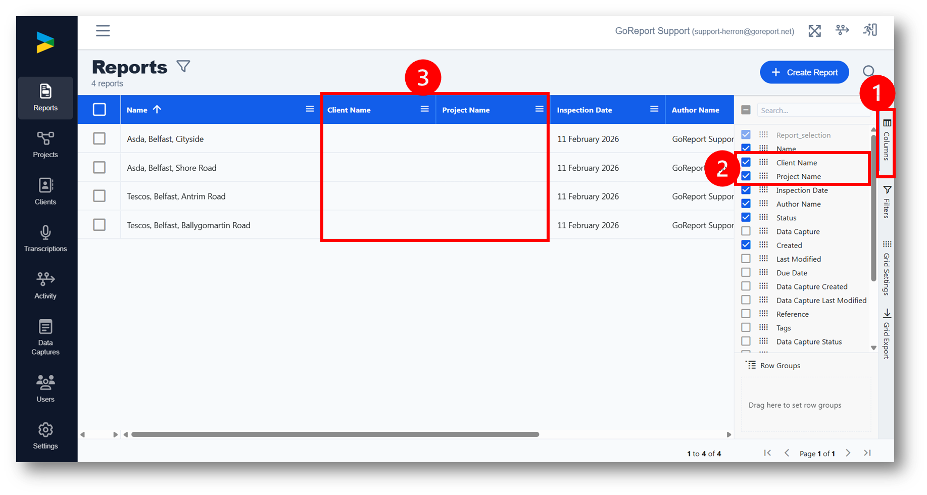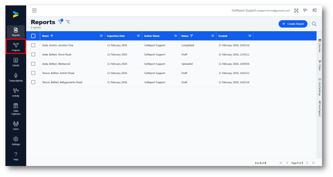 These need to added onto your account by GoReport, please contact helpdesk@goreport.com and ask to have clients / project switched on.