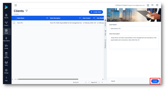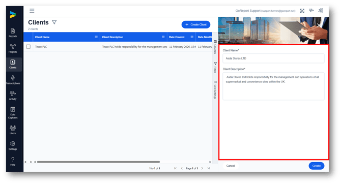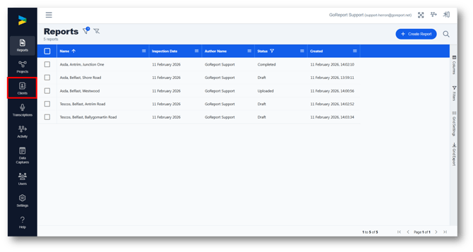 Clients and Projects are two seperate features that need to be added to your account - please contact helpdesk@goreport.com to request access to one or both of these features.