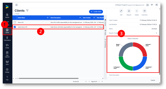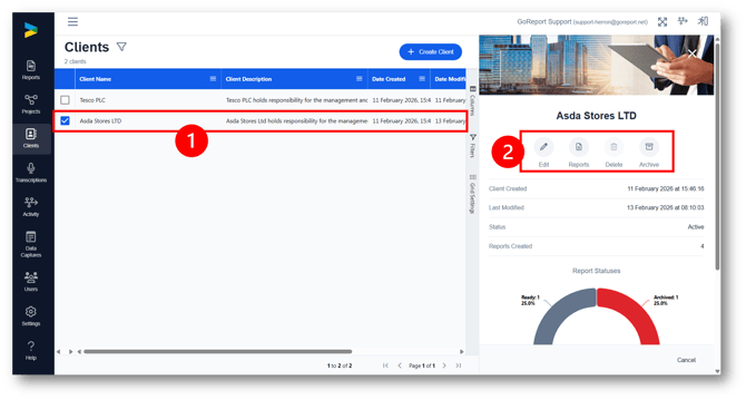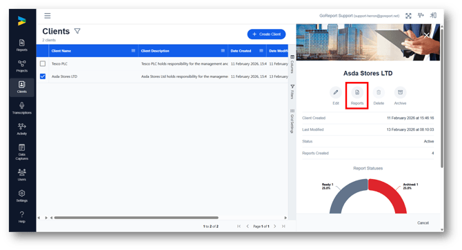 2. From here you can edit the Client details, view all reports assigned to a client, delete or archive the client.