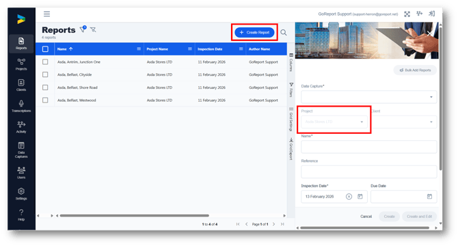 3. If you click Create Report while in a Project View the new report will default to be created within that project.