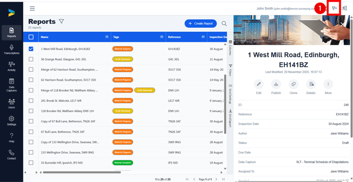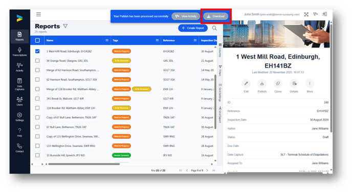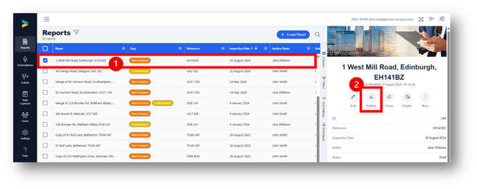 Log in to the GoReport Web Portal and find the report you want to export. Select the report and click the Publish button in the side bar.