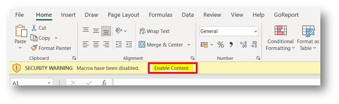 - Open the copy of the Master Macro you placed into the new folder you created at the start of the process. You might see the following ‘Security Warning’ along the top of the Excel document. Select Enable Content.