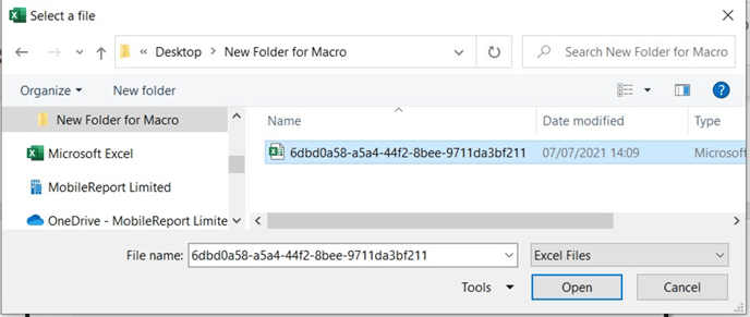 - A dialogue box will open for you to select a file. Locate the folder you have created that contains the copy of your Master Macro and the exported Excel from the GoReport Web Portal. Click the exported Excel and select ‘Open’.