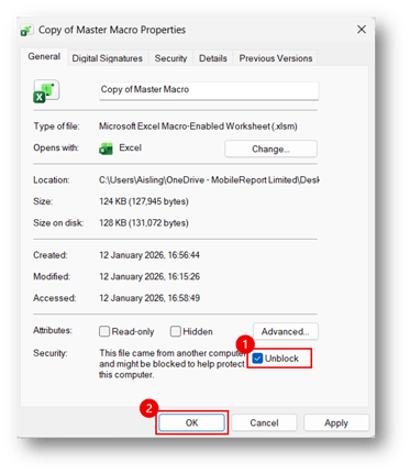 Tick the Unblock box as shown below, and click OK.